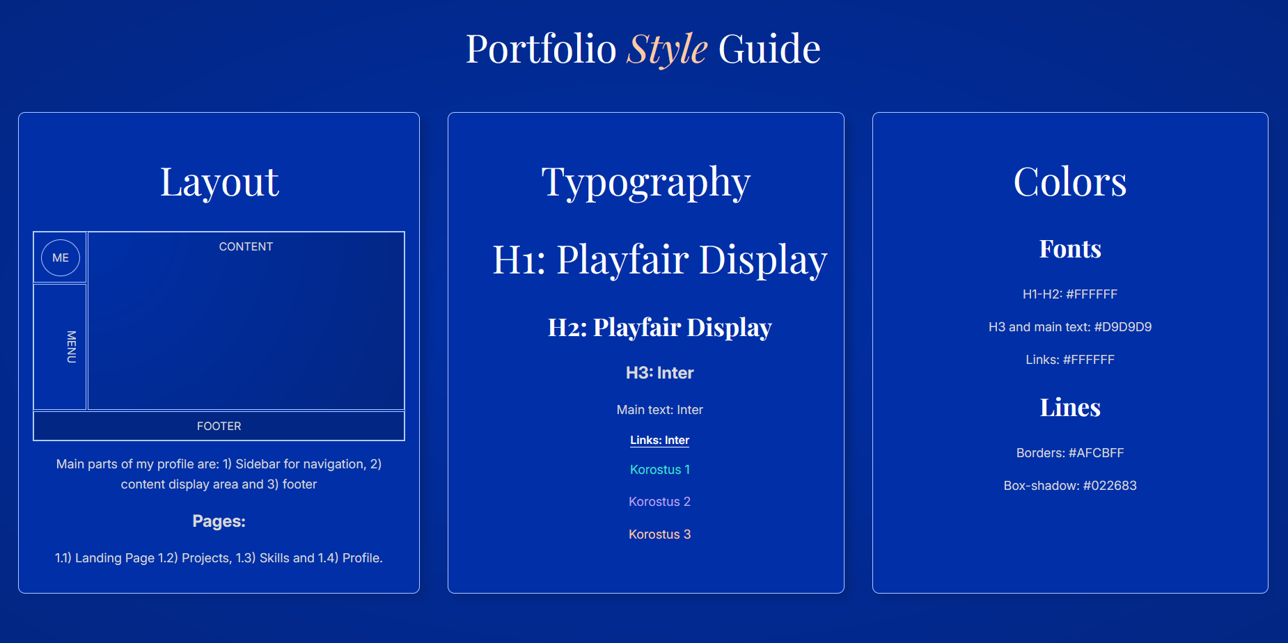 My first idea for this portfolio was to create a minimalist, monochromatic design. I've been drawn to blue since childhood, though I rarely use it in my work now. Perhaps from that early fascination and my art history studies, I recalled Klein's Blue: a color with a powerful identity and story. I wanted to use it as a background color to give the page a striking base that would boldly stand out.